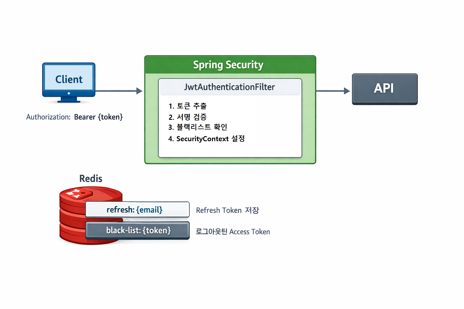 - 로그아웃 시 Access Token을 블랙리스트에 등록하고, Refresh Token을 삭제한다